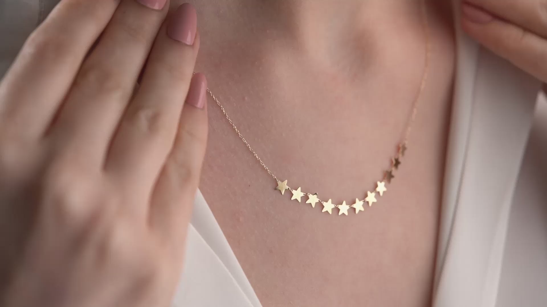 Gökyüzünün zarafetinden ilham alan bu kolye, tamamı 14 ayar altından üretilmiş 11 adet 5 mm yıldız figürü ile tasarlandı. Hafif ve zarif tasarımıyla günlük kullanımda veya özel günlerde şıklığınızı tamamlar.