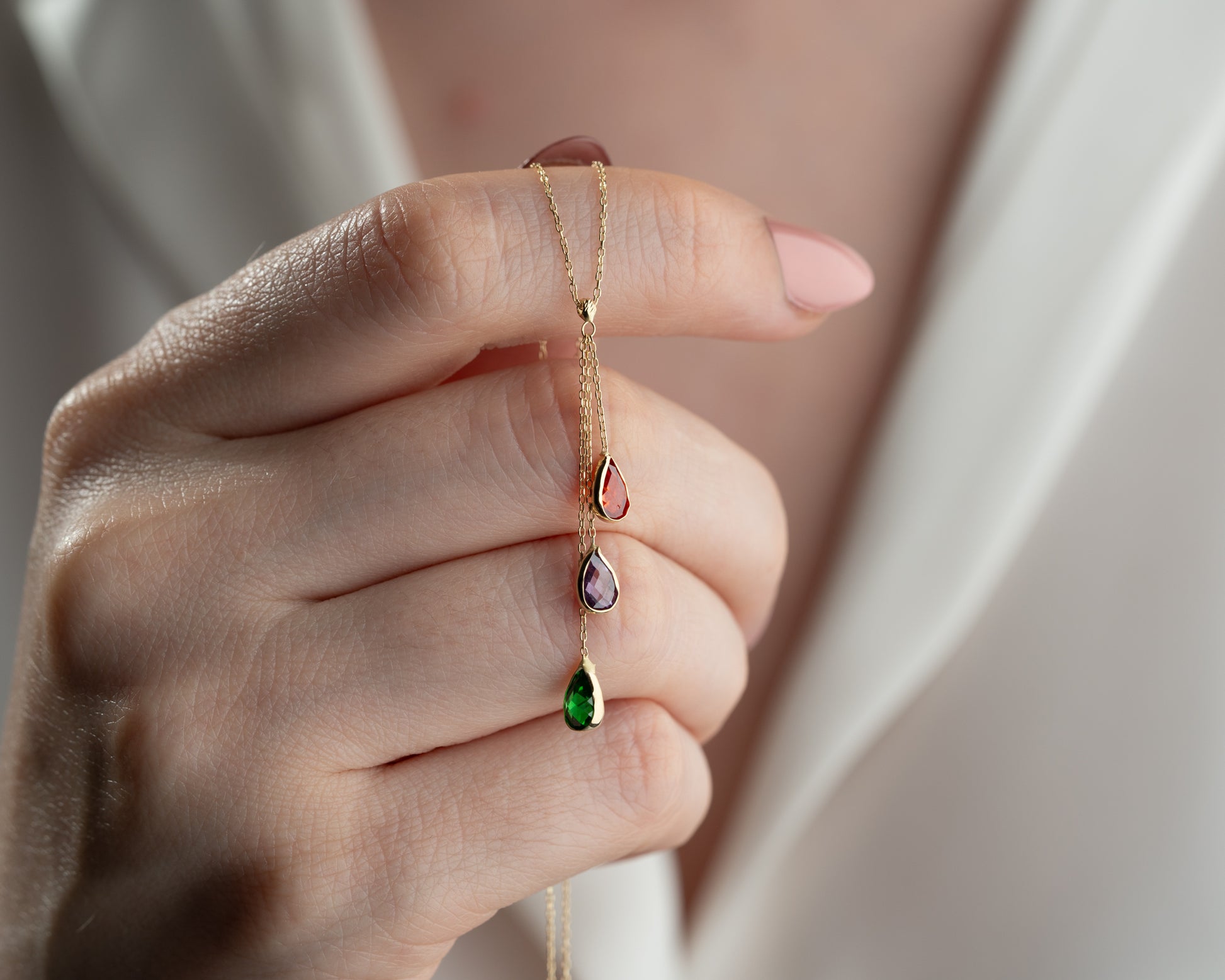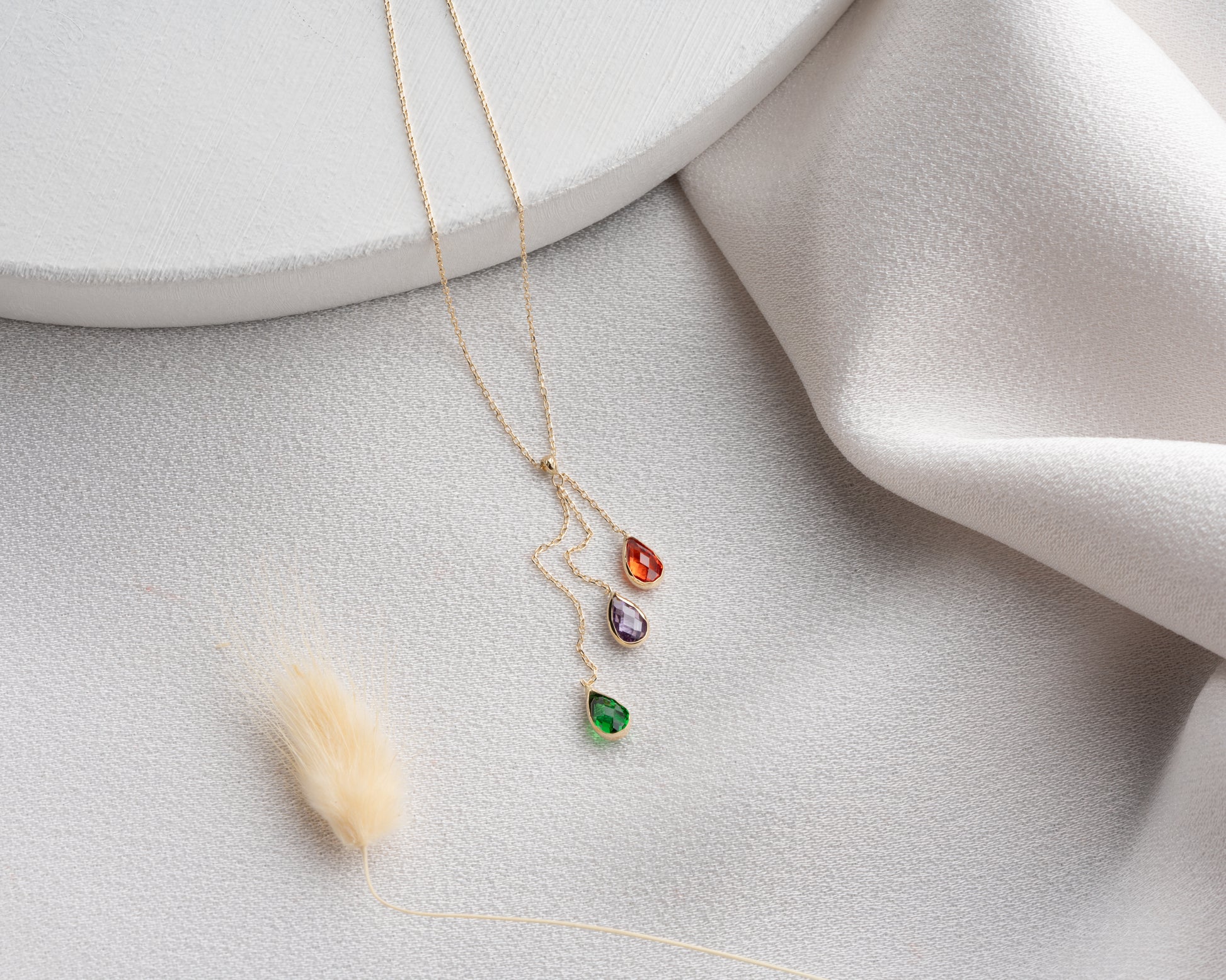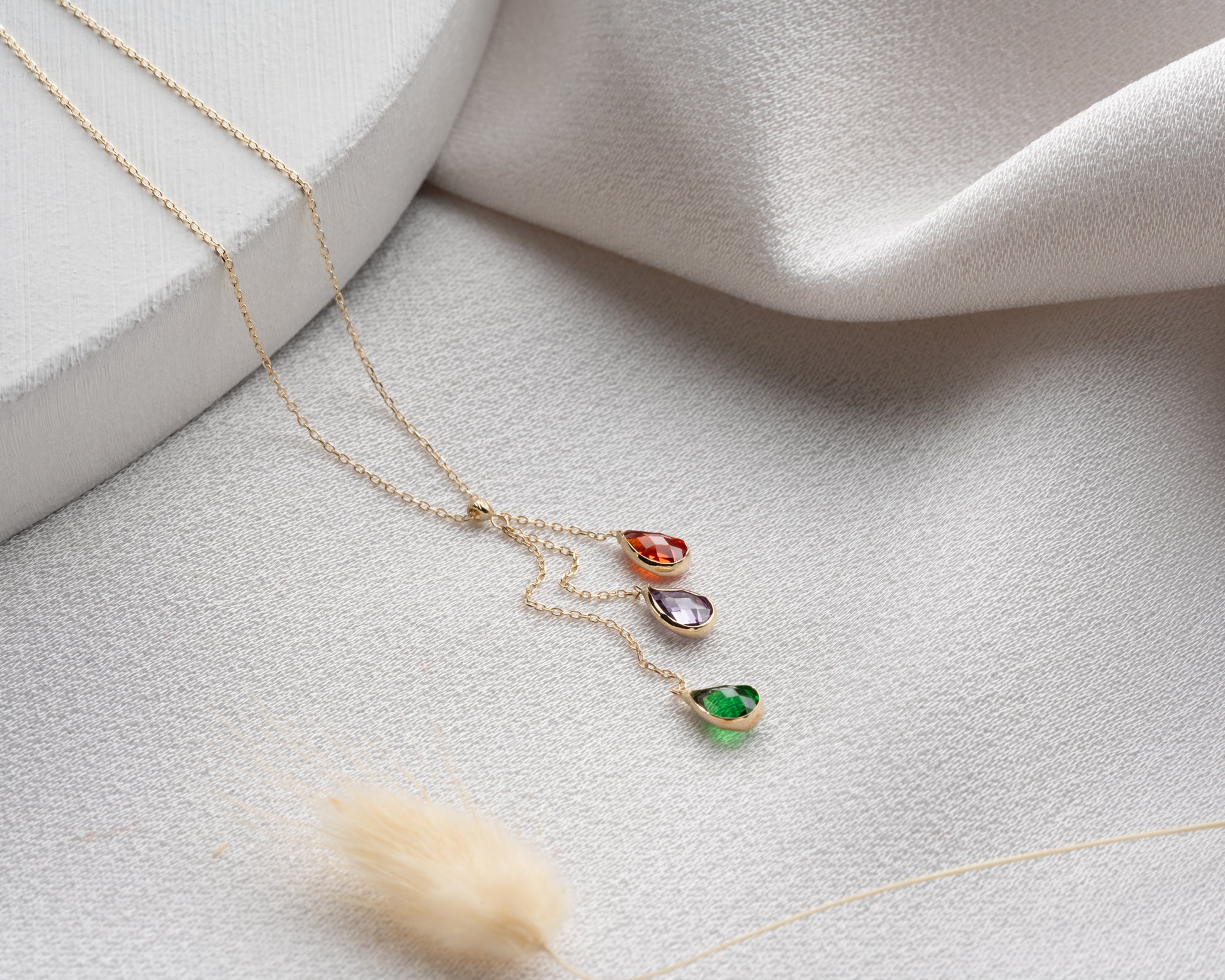 Zarafeti ve canlı renkleri bir araya getiren bu 14 ayar altın kolye, üç adet 4x6 mm boyutunda damla formda renkli taş ile tasarlanmıştır. Zincir uzunluğu 42 cm + 3 cm uzatma payı ile toplam 45 cm’dir. Kolye yaklaşık 1.50 gram ağırlığındadır (%10 üretim toleransı olabilir).