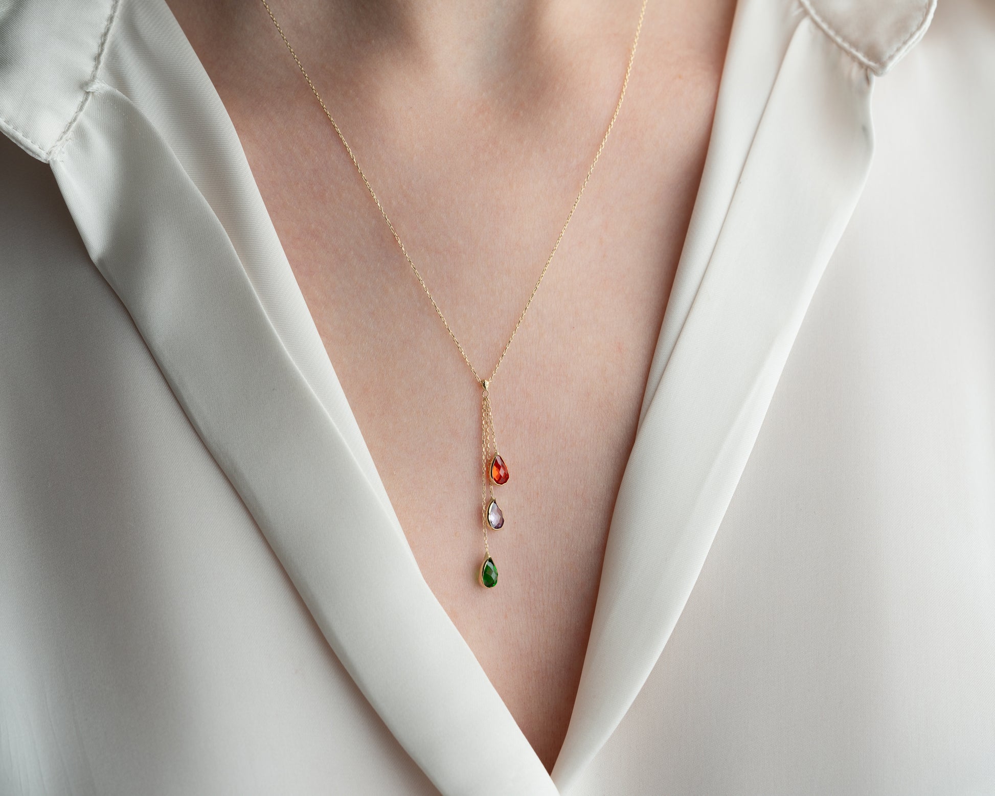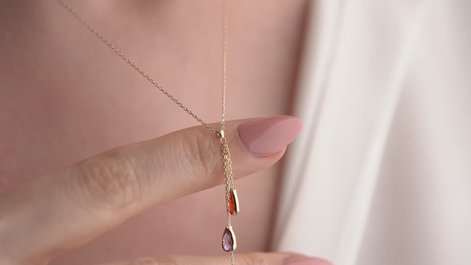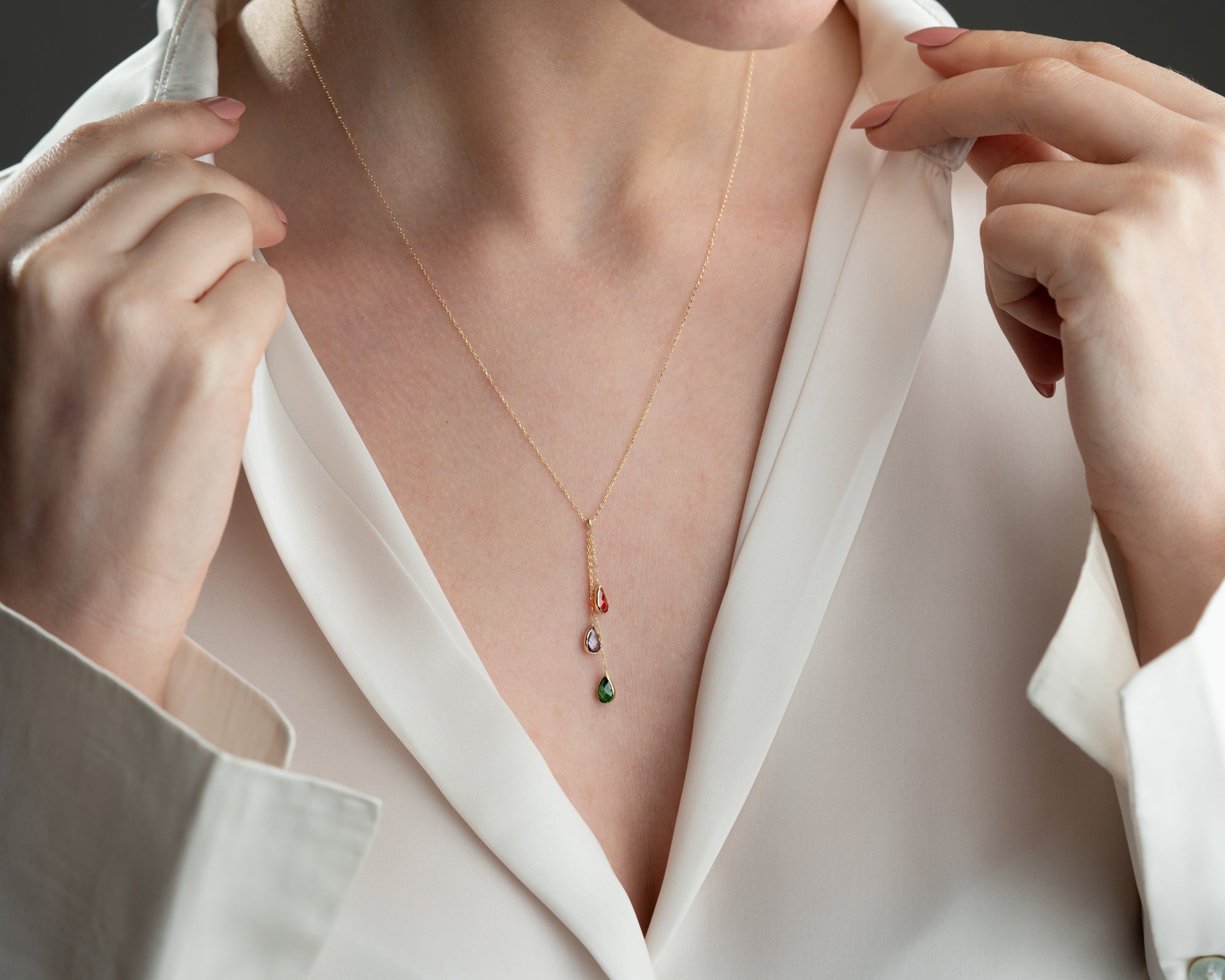Zarafeti ve canlı renkleri bir araya getiren bu 14 ayar altın kolye, üç adet 4x6 mm boyutunda damla formda renkli taş ile tasarlanmıştır. Zincir uzunluğu 42 cm + 3 cm uzatma payı ile toplam 45 cm’dir. Kolye yaklaşık 1.50 gram ağırlığındadır (%10 üretim toleransı olabilir).