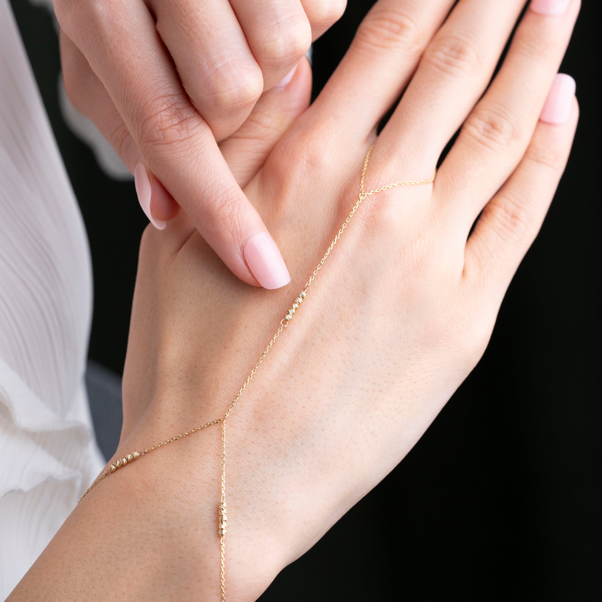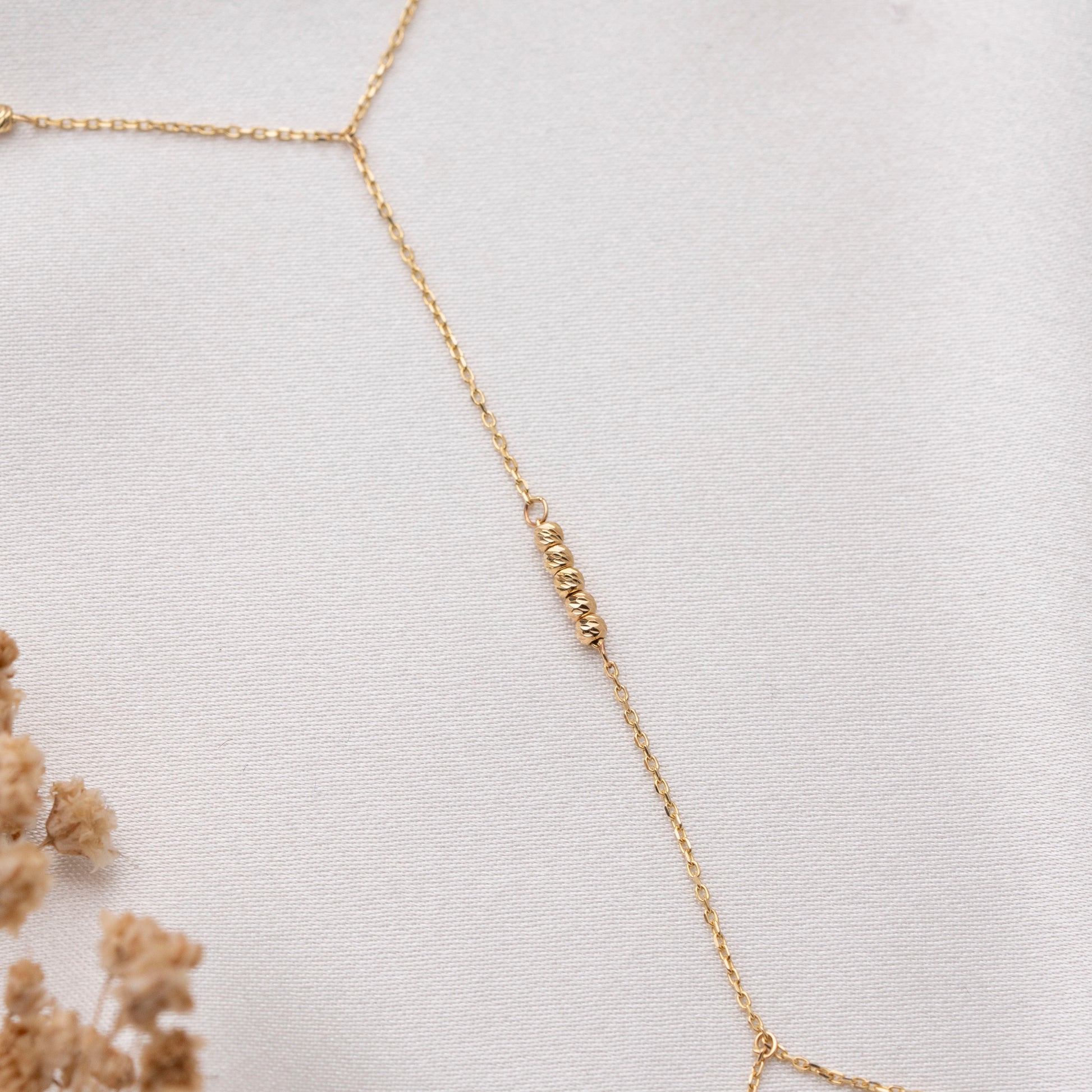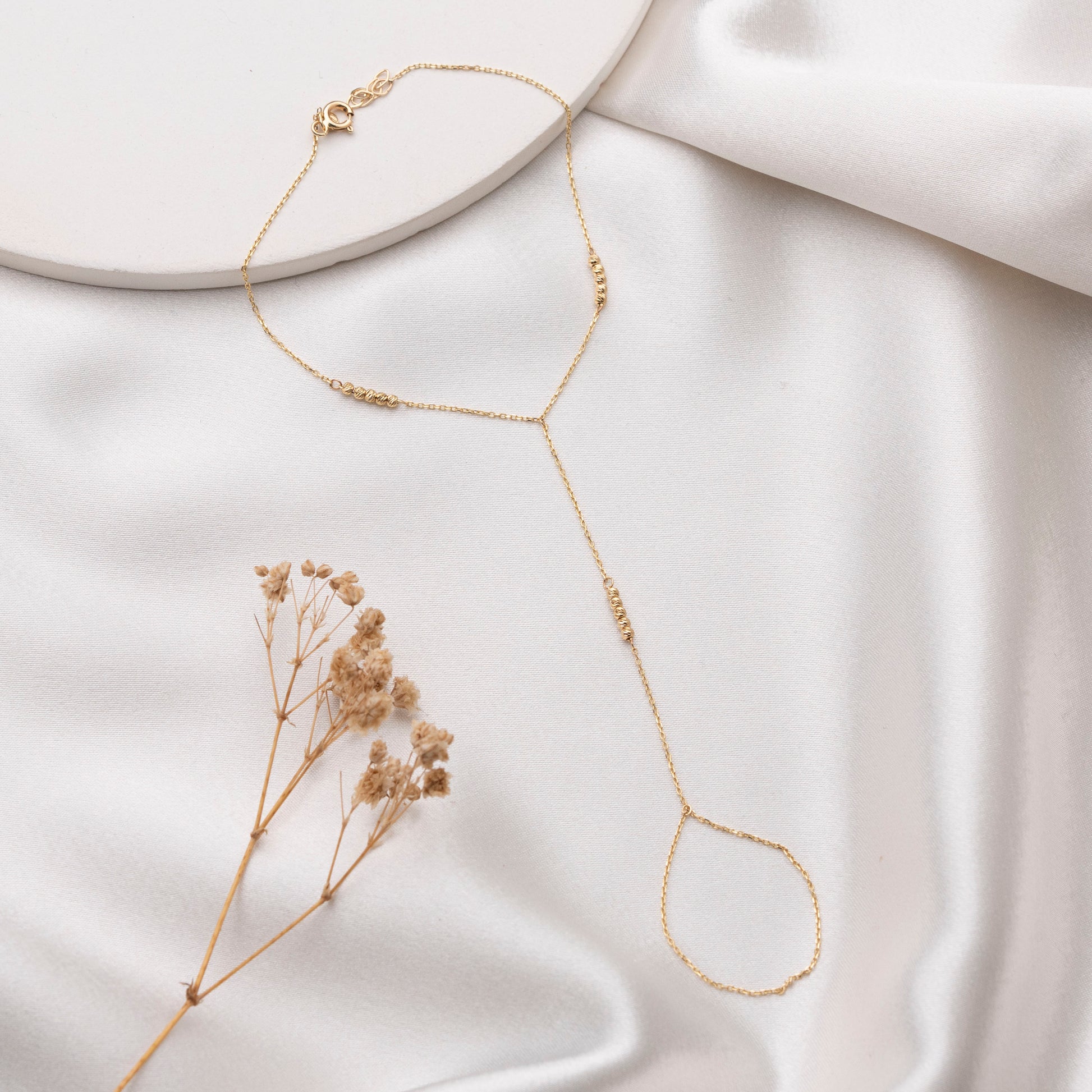 Bileklik üzerinde 2 mm ölçüsünde 15 adet altın top bulunmaktadır. Toplar, zincir üzerinde 5’erli gruplar halinde üç ayrı noktada yerleştirilmiştir. Bu düzenleme, sade ve dengeli bir görünüm sunar.