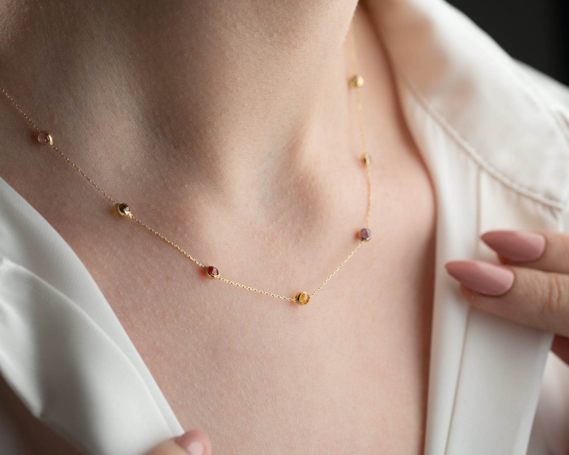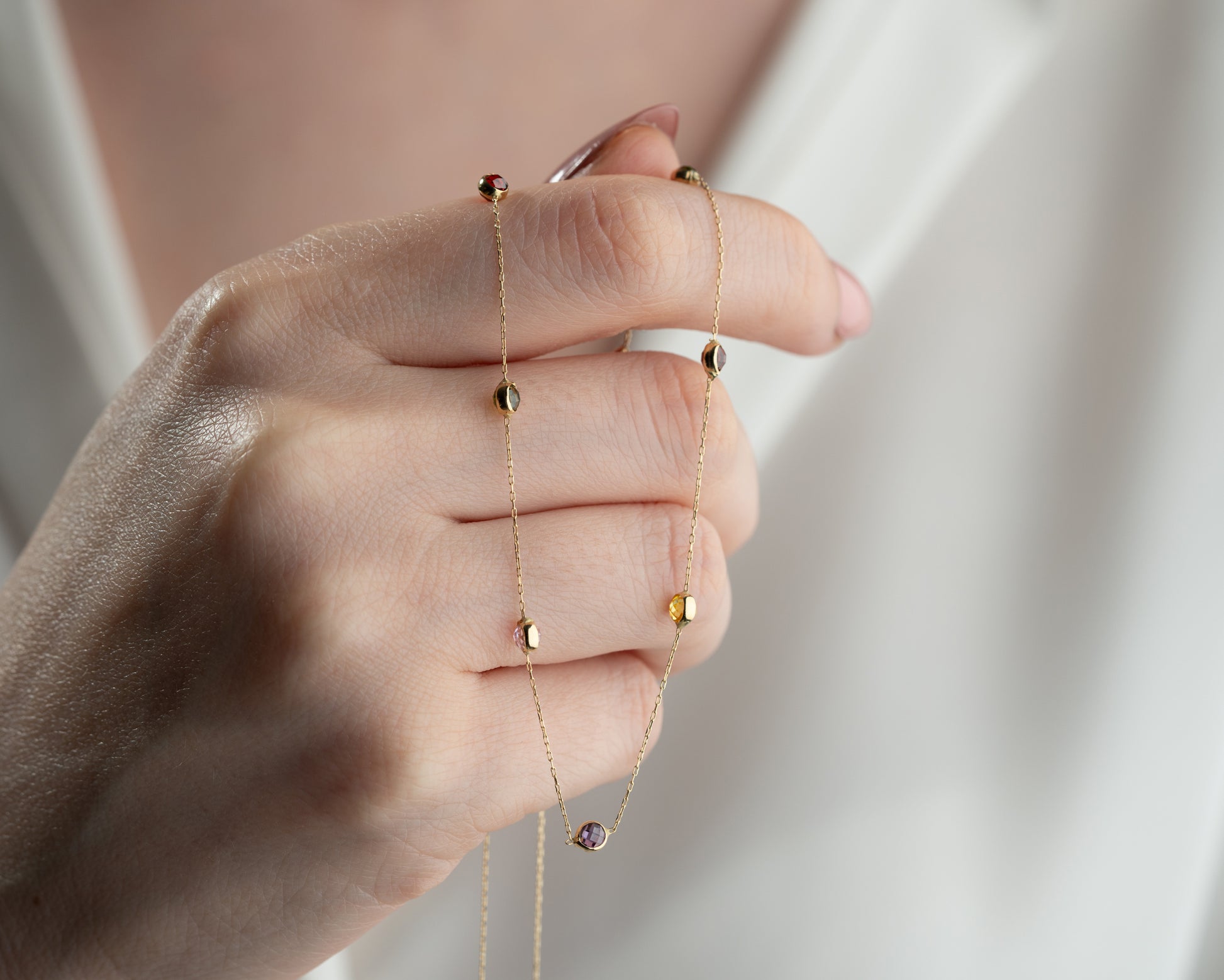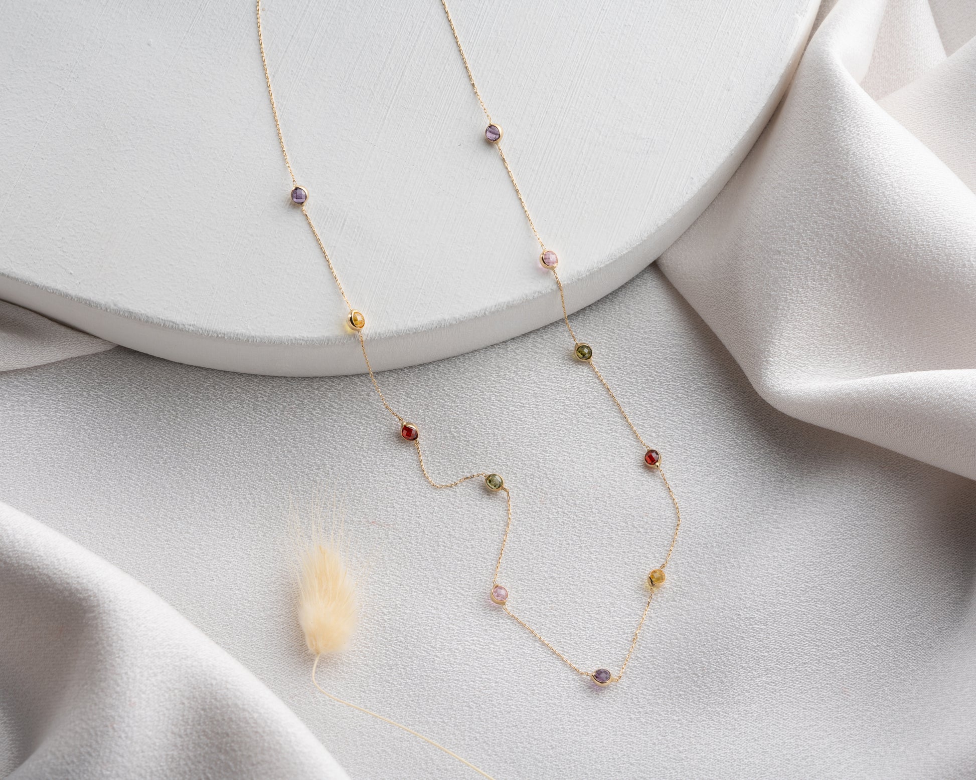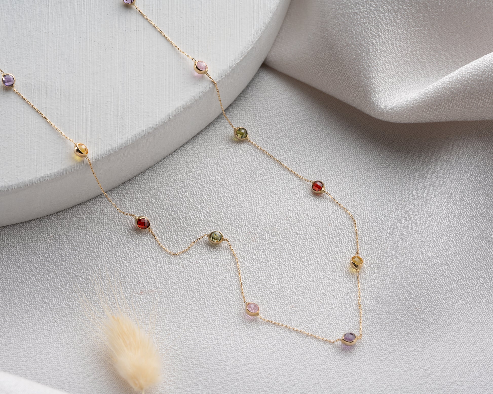 14 Ayar Altın Karışık Taşlı Kolye Amatist, Topaz, Pembe, Peridot ve Garnet Taşlı, 11 Adet 3mm Taş,