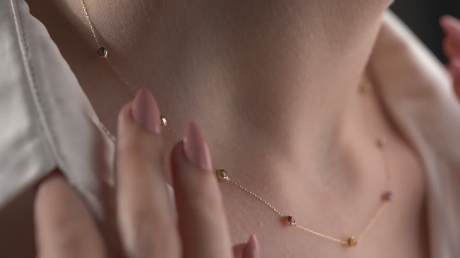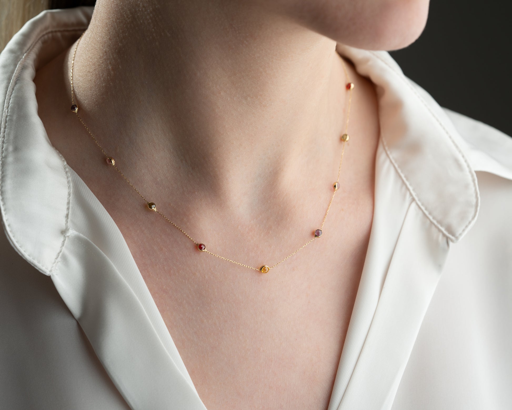 Göz alıcı renk geçişleriyle hazırlanan bu şık kolye, 14 ayar altın forse zincir üzerine dizilmiş 11 adet 3 mm taş ile tasarlanmıştır.