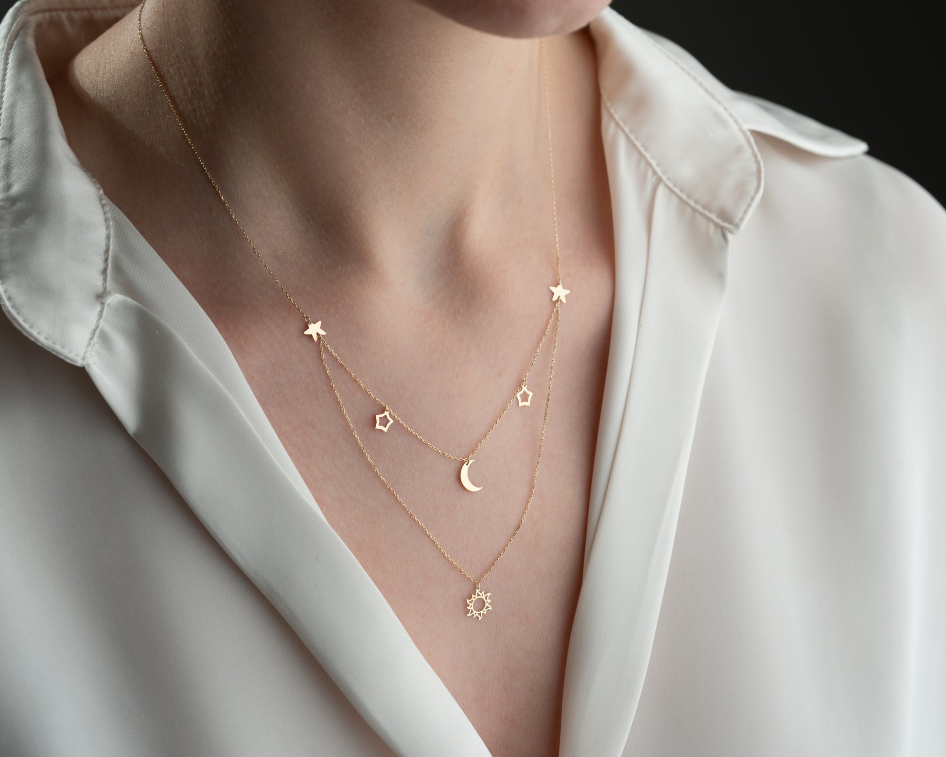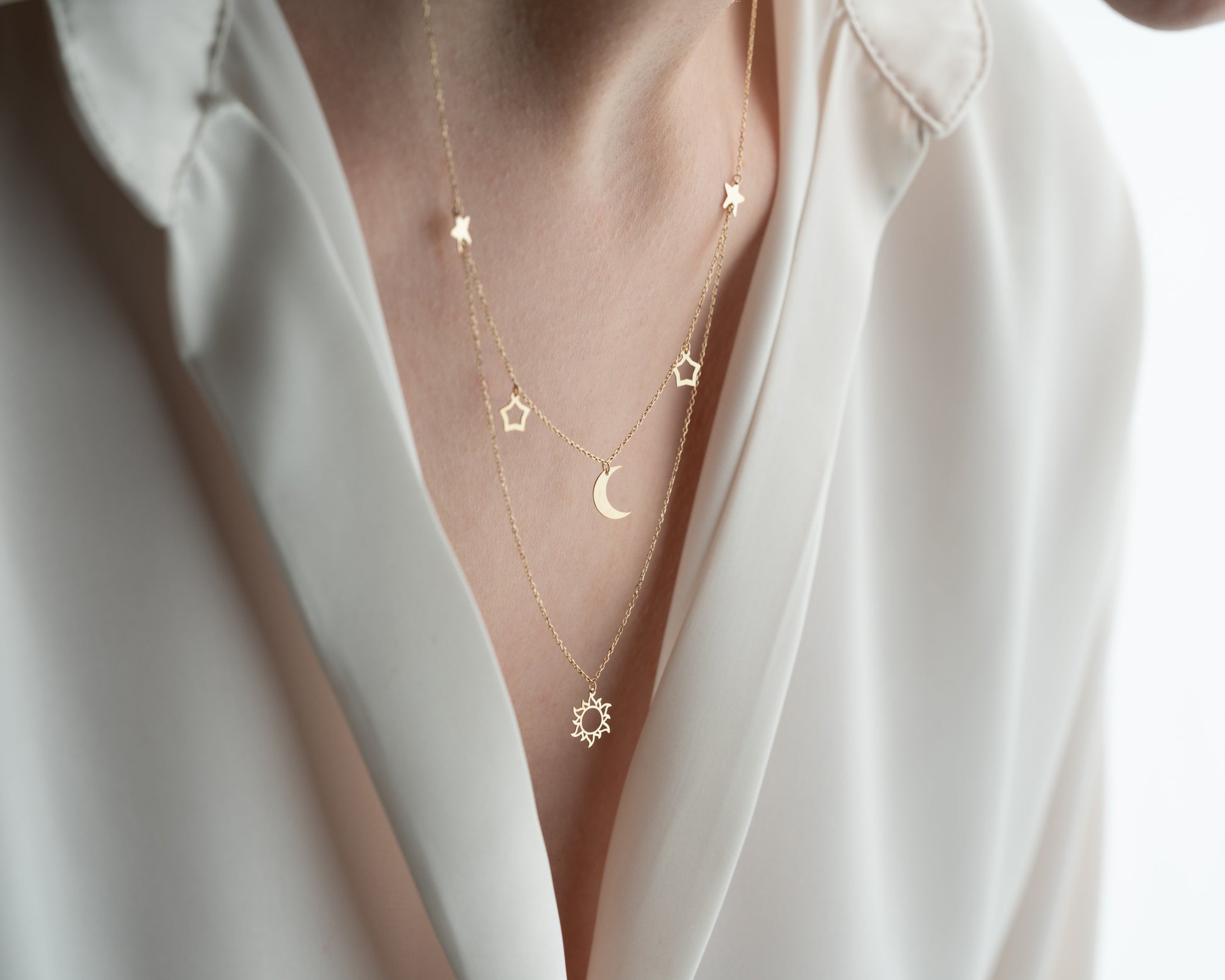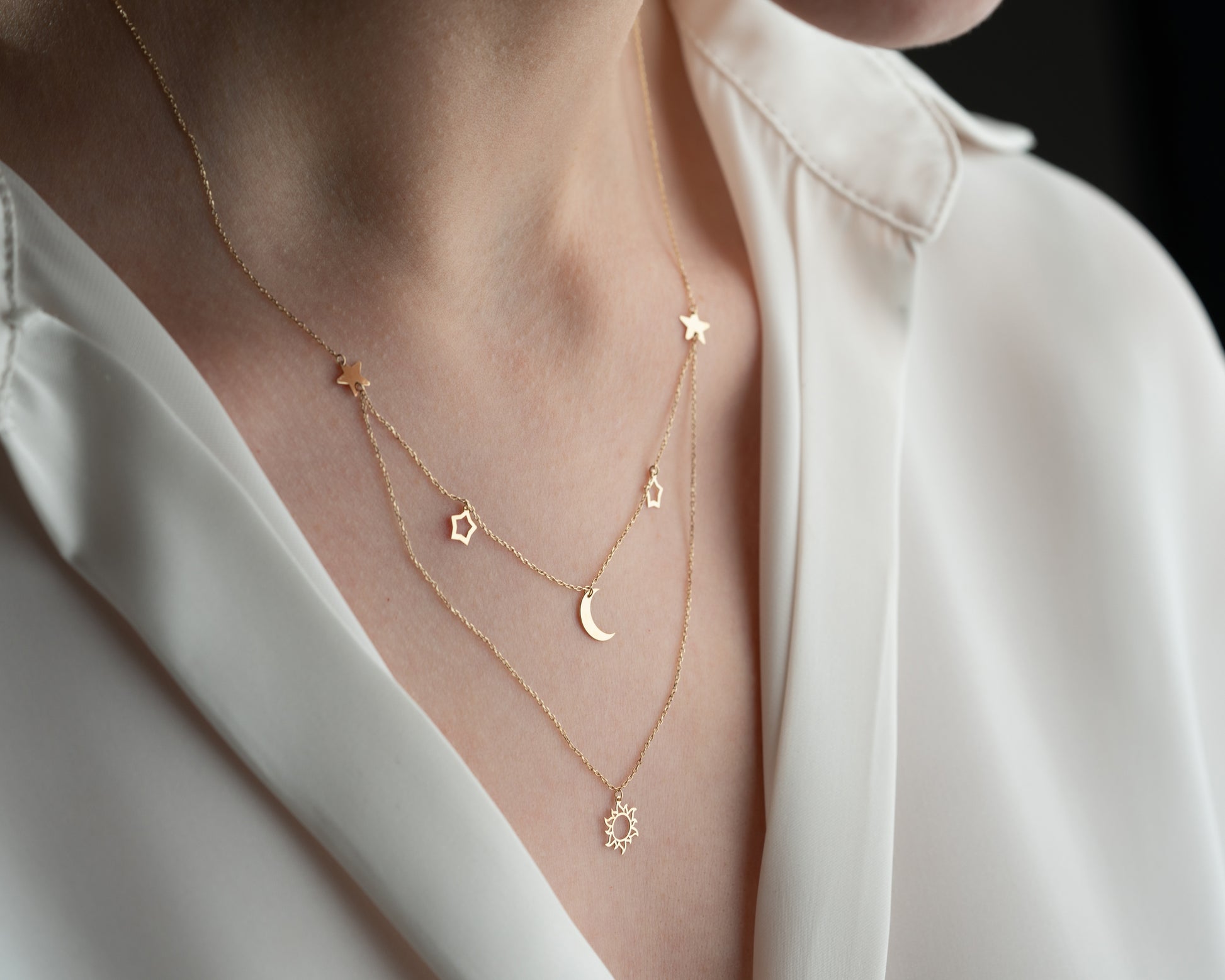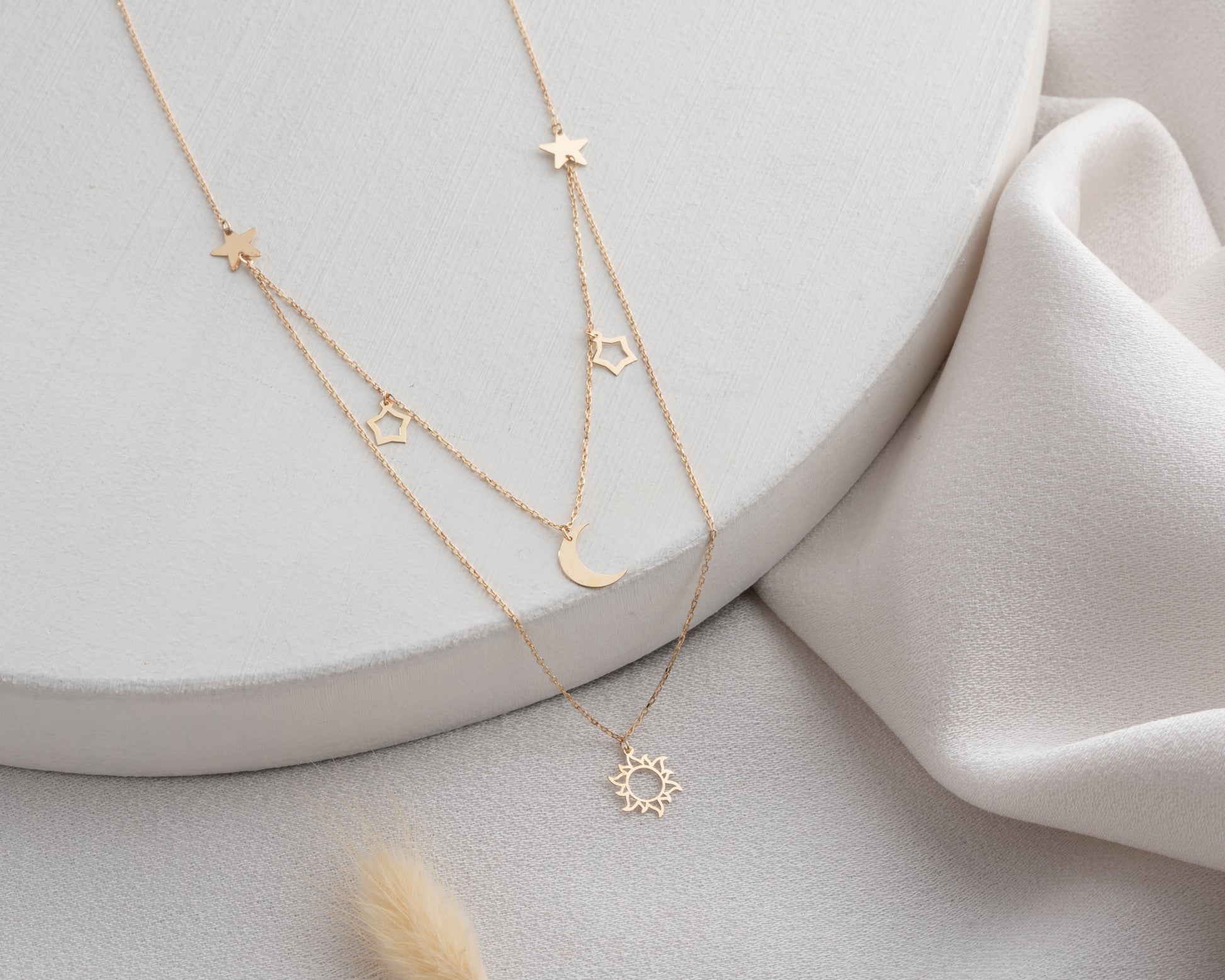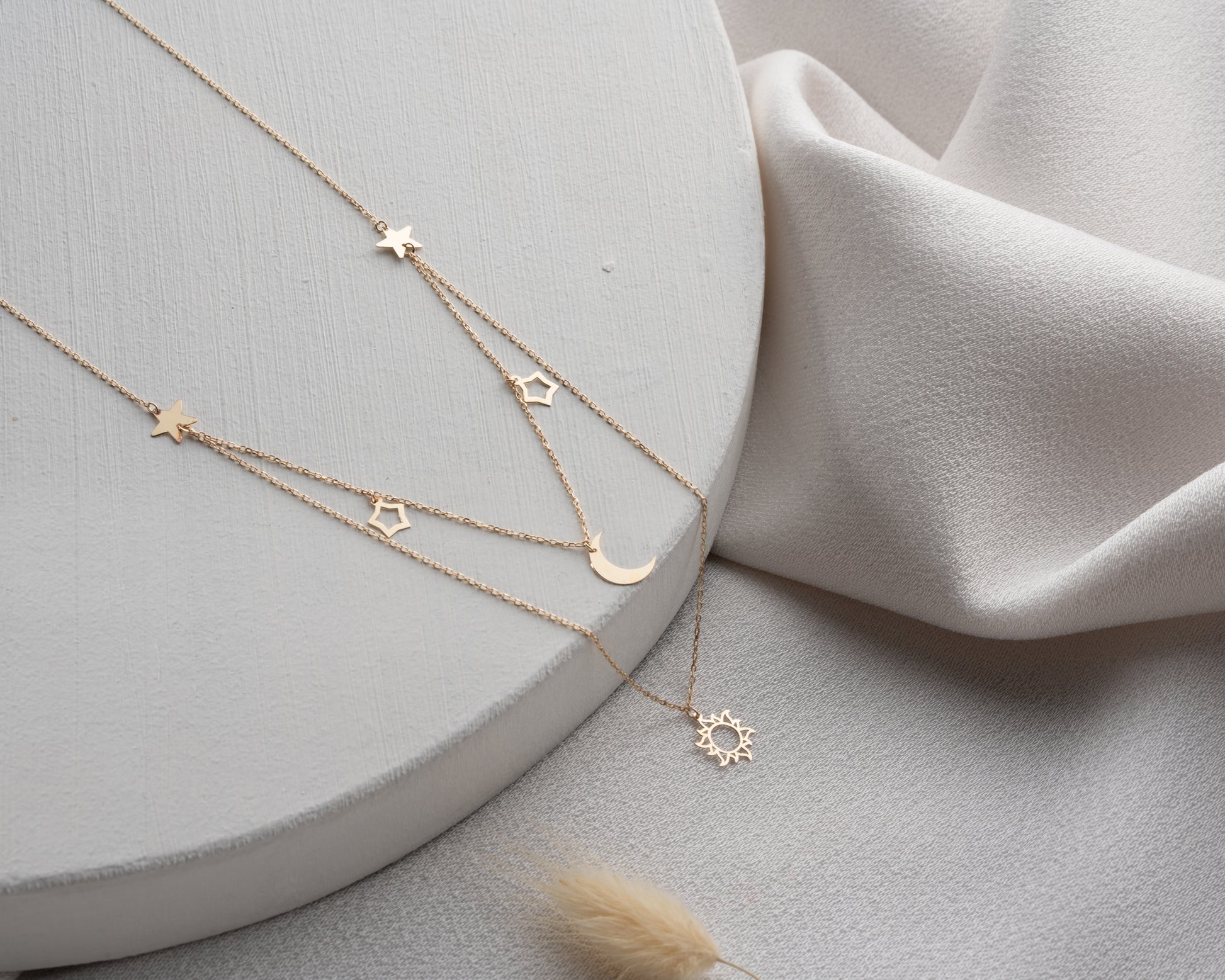 14 Ayar Altın Güneş, Ay ve Yıldız Katmanlı Kolye – Minimal ve Zarif Tasarım