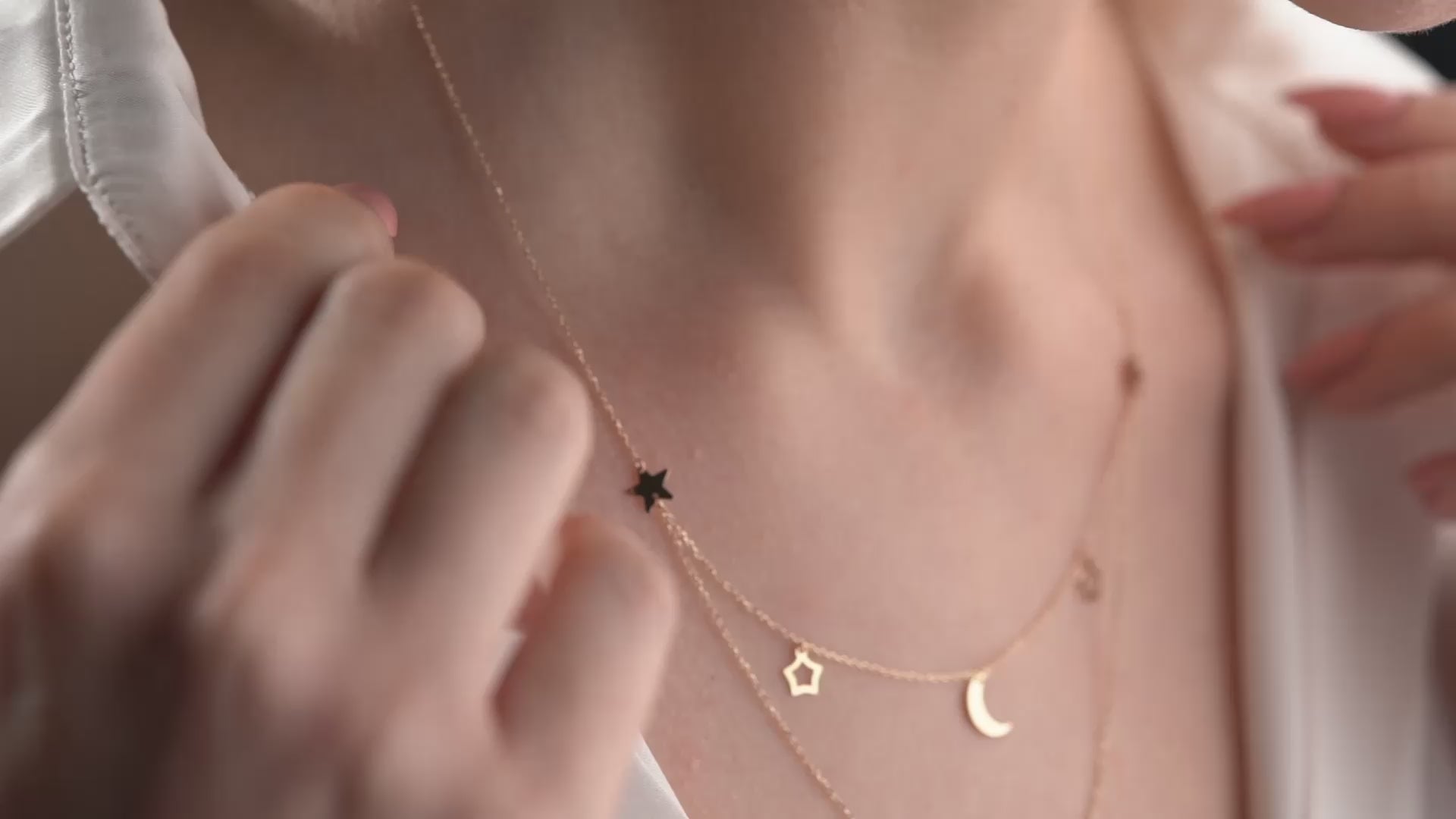 Gökyüzünün büyüleyici sembollerini taşıyan bu 14 ayar altın kolye, 8mm güneş, 7mm ay ve 5mm yıldız detaylarıylatasarlanmıştır. Özel iki katmanlı yapısı sayesinde hem günlük kullanım hem de özel günler için şık bir tamamlayıcıdır.