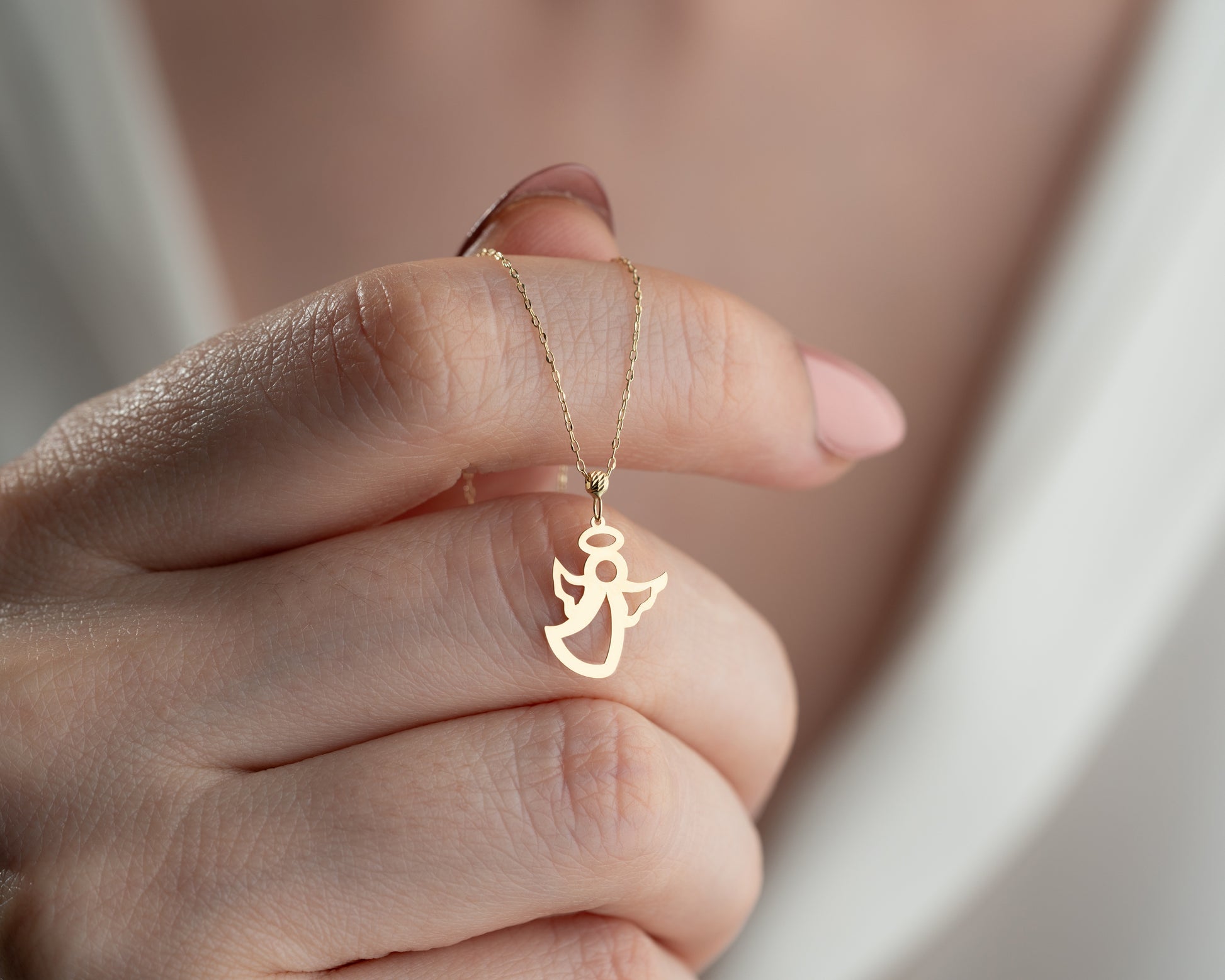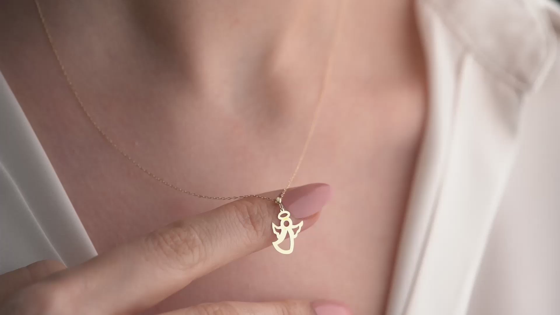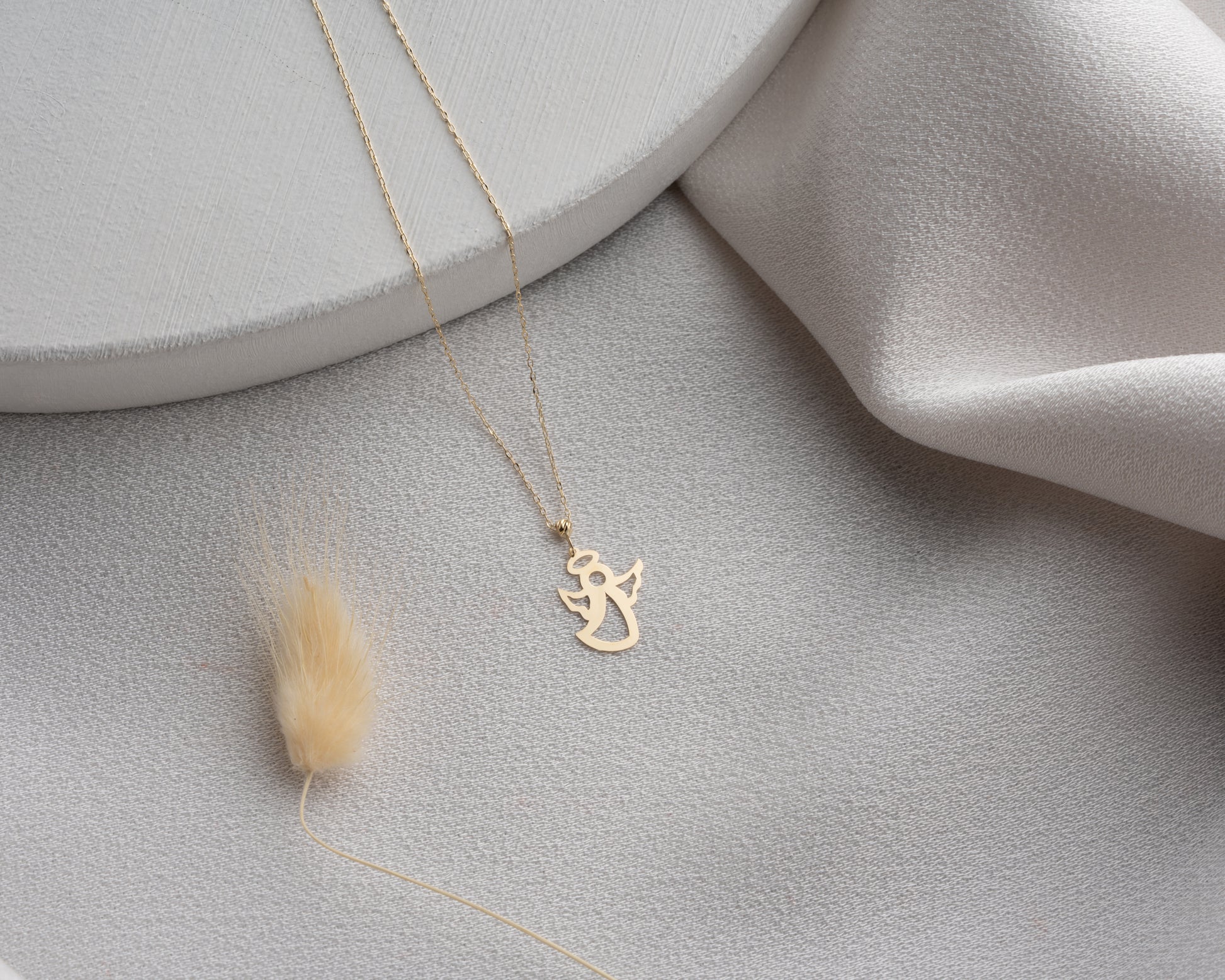 Tamamı 14 ayar altından üretilmiş bu zarif melek kolyesi, sevgi ve korumayı simgeler. Kolyenin melek figürü 1.2 cm yüksekliğindedir ve yaklaşık 0.90 gram ağırlığındadır.