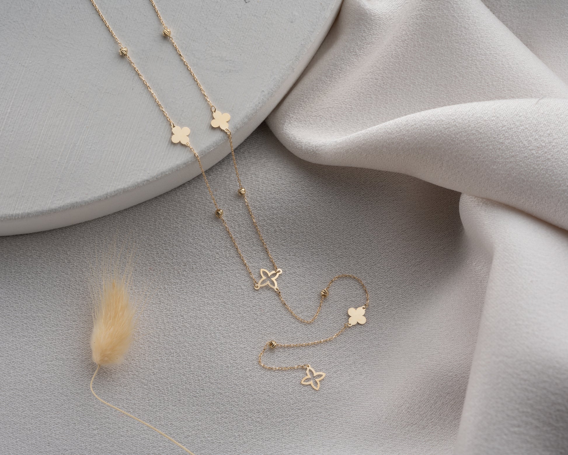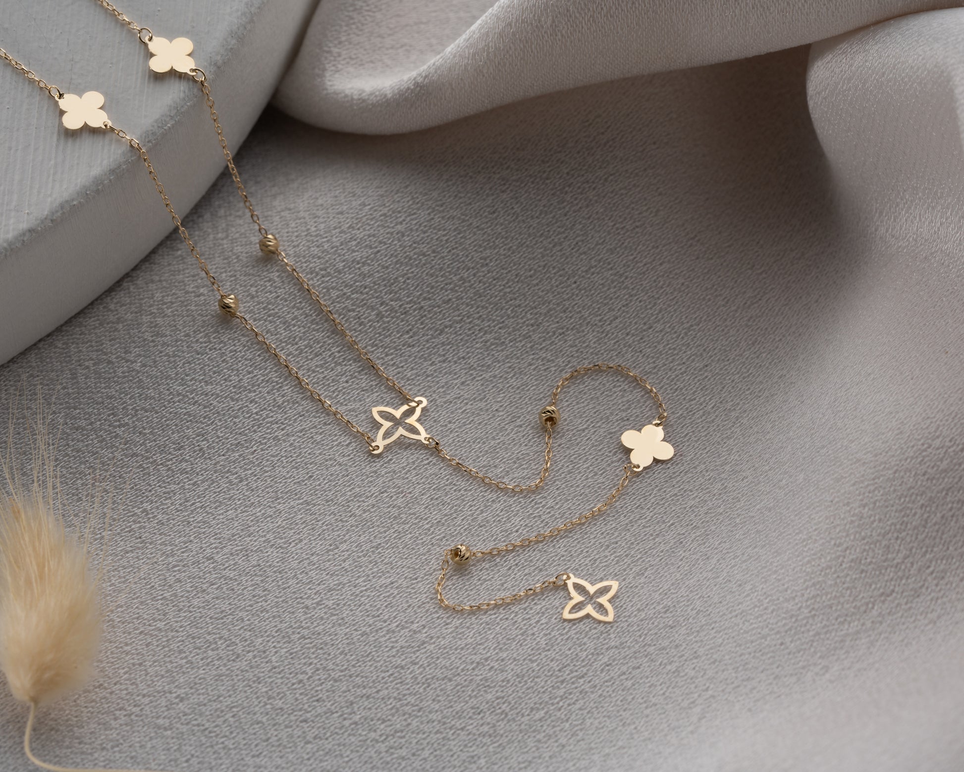 - 14 ayar sarı altın, 7 papatya figürü 6 dorika toplu altın zincir