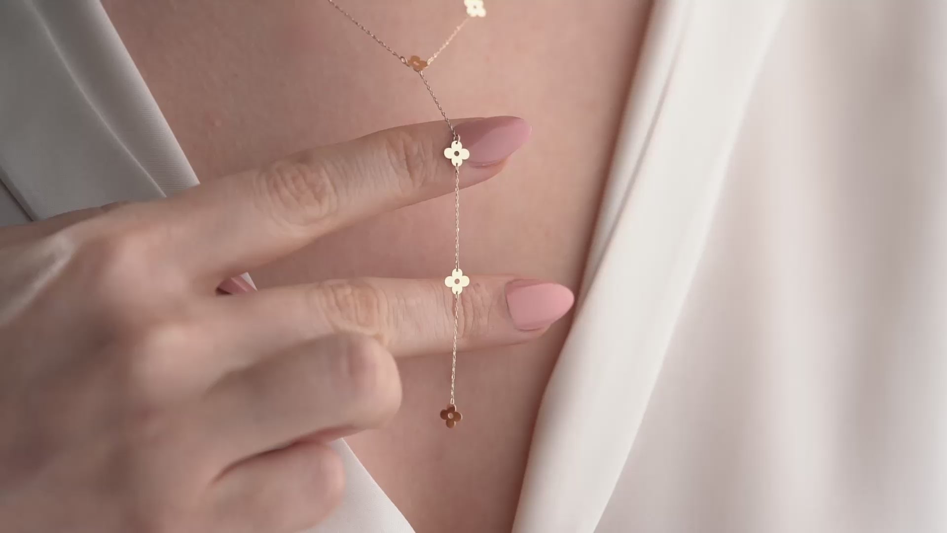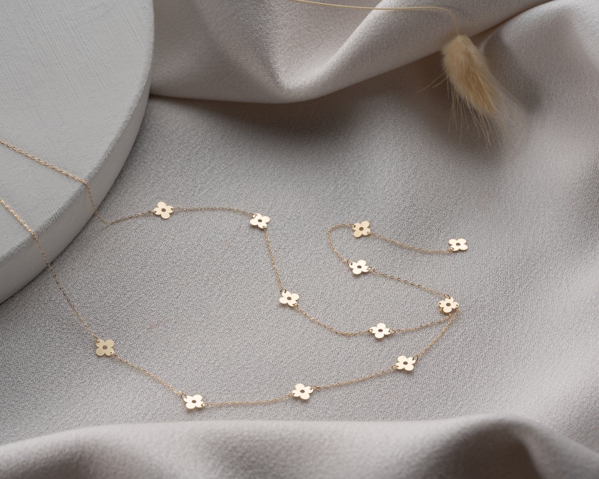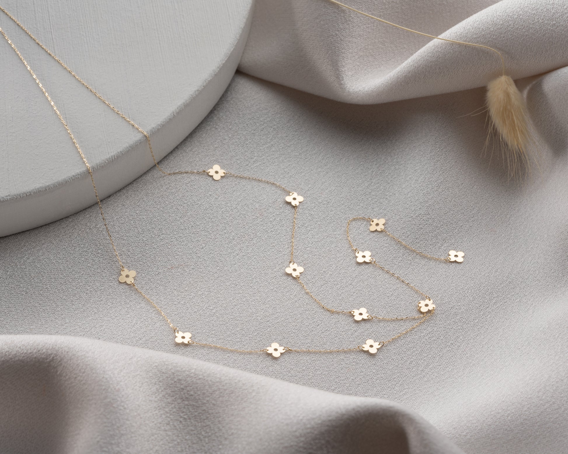 MinimalGoldAtelier’in zarif dokunuşu ile tasarlanmış bu 14 ayar altın Y kolye, ince detayları ve şık tasarımıyla günlük kullanımdan özel davetlere kadar her anınıza eşlik eder. 5mm boyutunda 12 adet papatya figürüince zincir boyunca dizilmiştir, minimal ve feminen bir görünüm sunar.