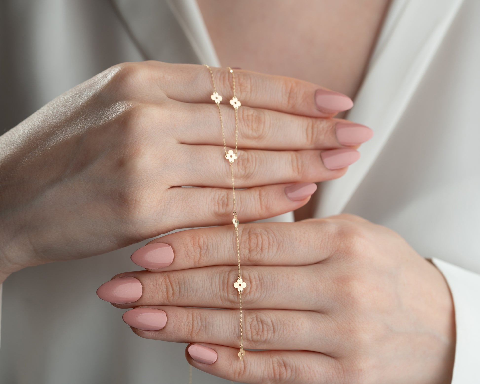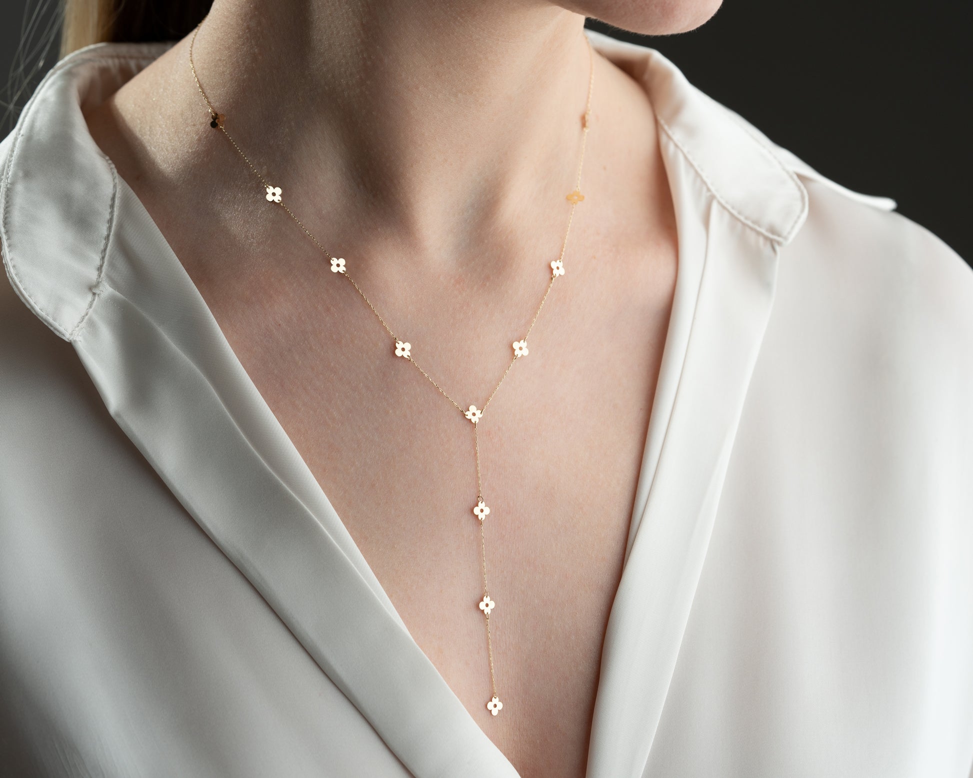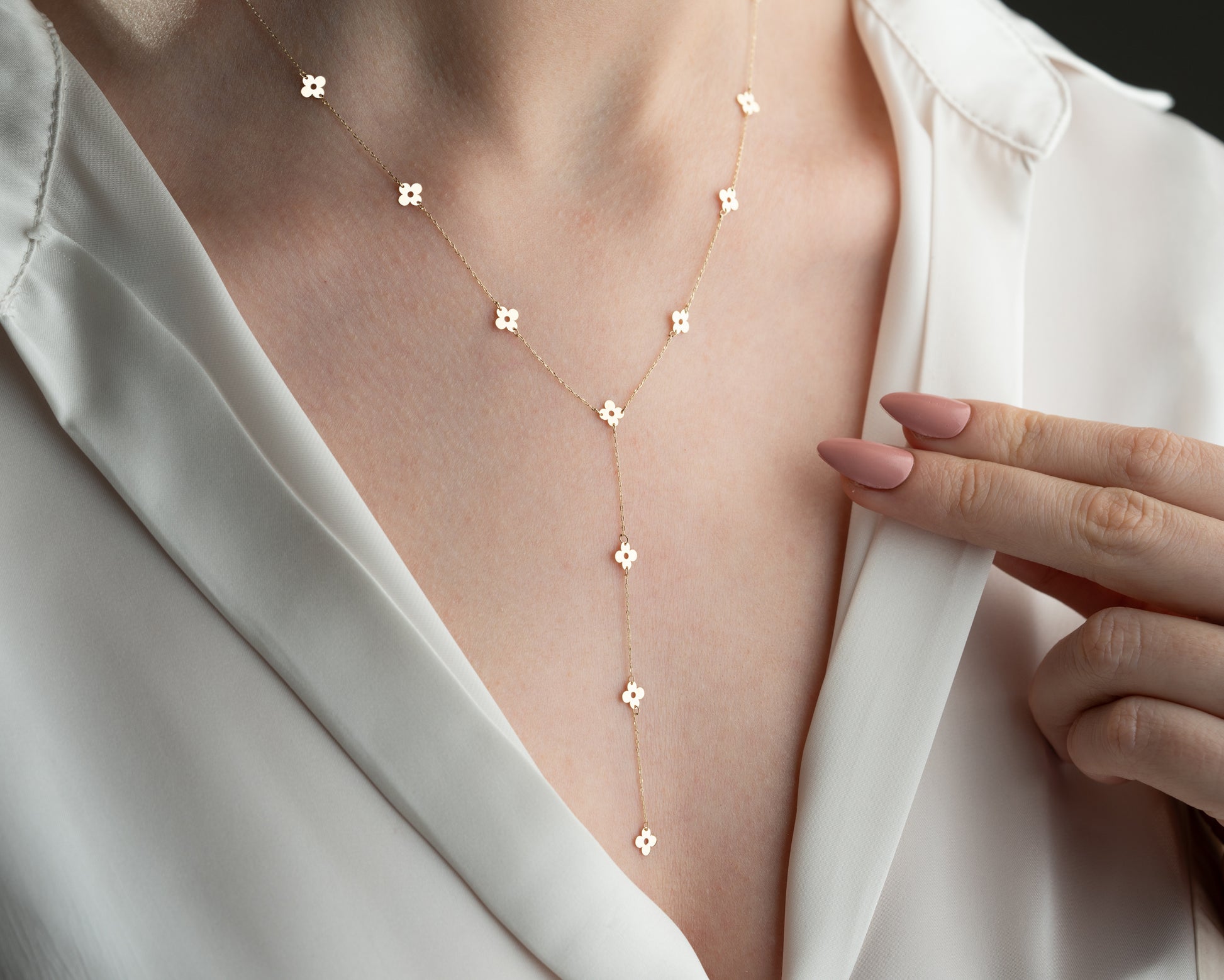 MinimalGoldAtelier’in zarif dokunuşu ile tasarlanmış bu 14 ayar altın Y kolye, ince detayları ve şık tasarımıyla günlük kullanımdan özel davetlere kadar her anınıza eşlik eder. 5mm boyutunda 12 adet papatya figürüince zincir boyunca dizilmiştir, minimal ve feminen bir görünüm sunar.