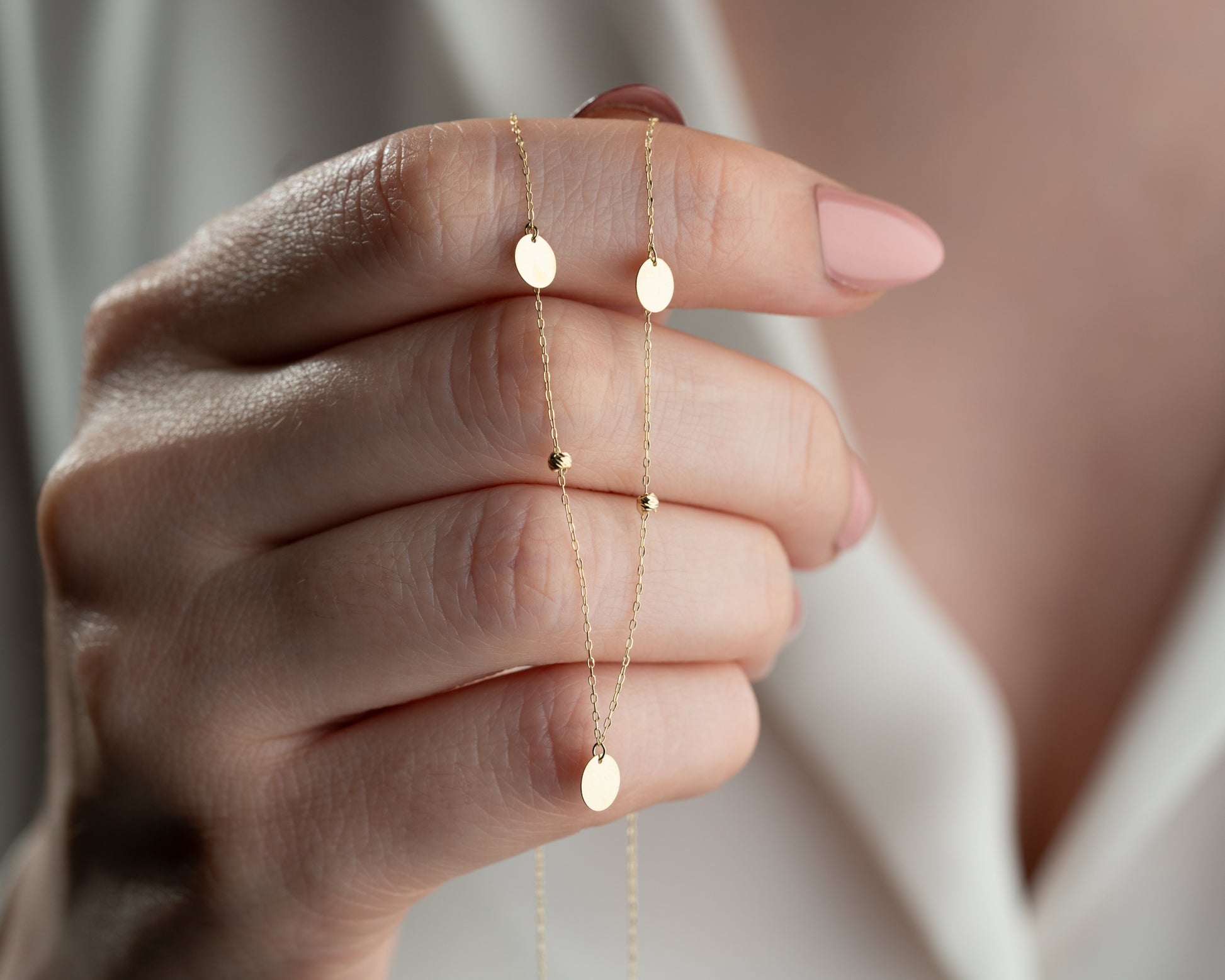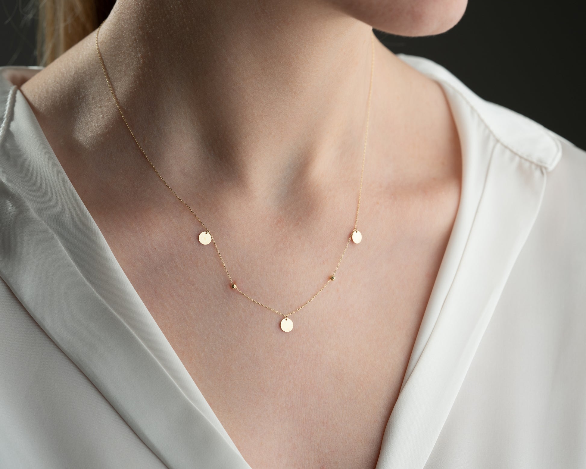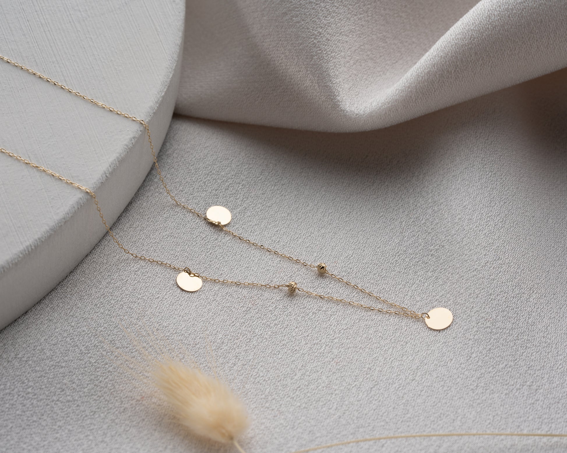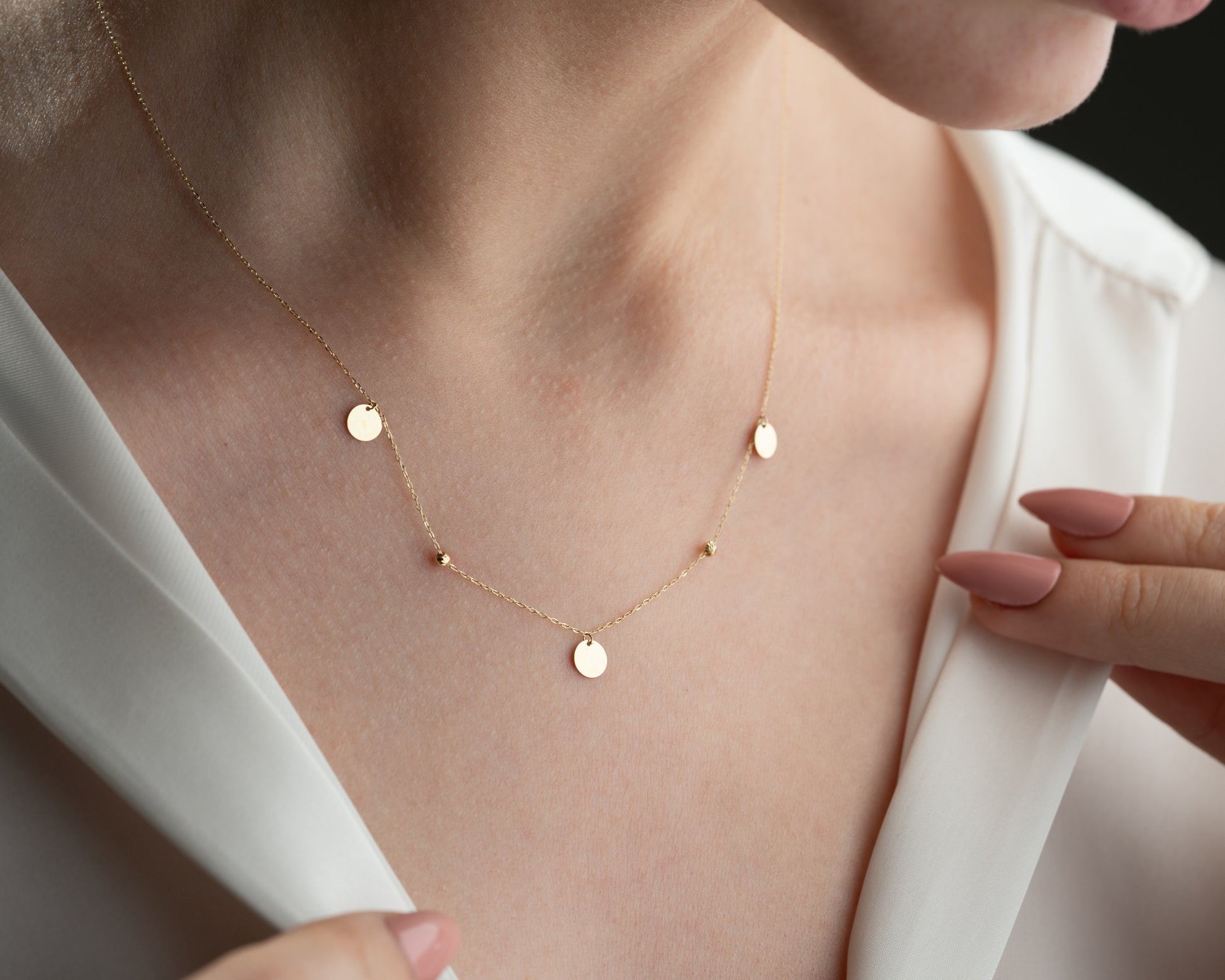 MinimalKolye’nin zarif dokunuşu ile tasarlanmış bu 14 ayar altın kolye, ince detayları ve şık tasarımıyla günlük kullanımdan özel davetlere kadar her anınıza eşlik eder. 5mm boyutunda 3 adet plaka figürü ince zincir boyunca dizilmiştir, minimal ve feminen bir görünüm sunar.
