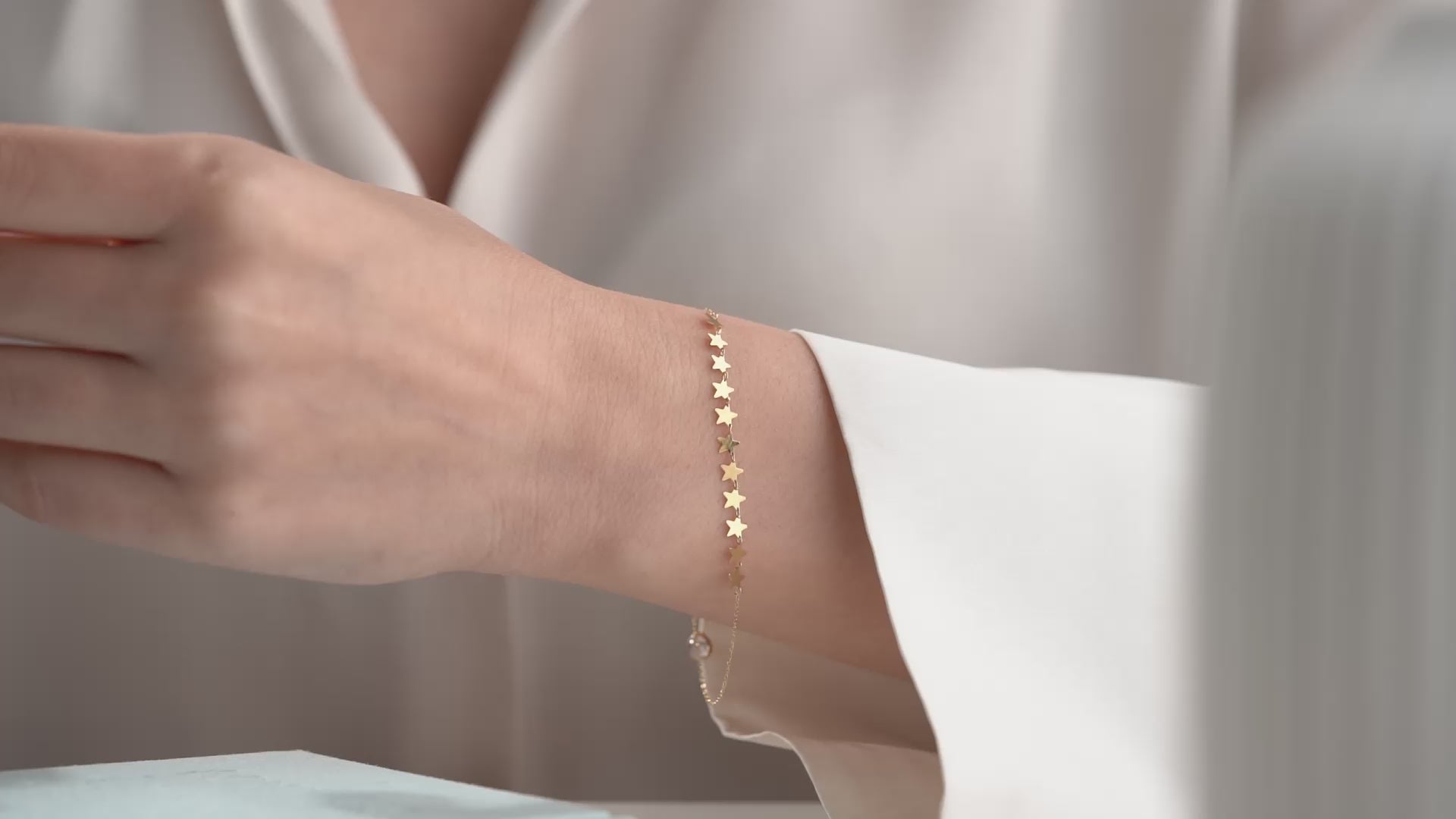 - Yıldız motifleriyle süslenmiş bu bileklik, göz alıcı bir görünüm sunarken aynı zamanda zarifliği ön plana çıkarır.