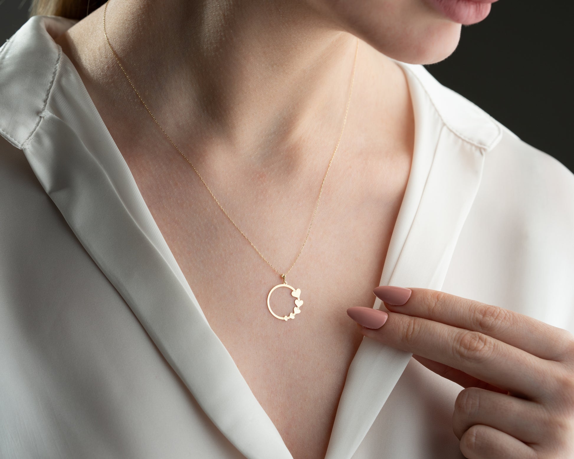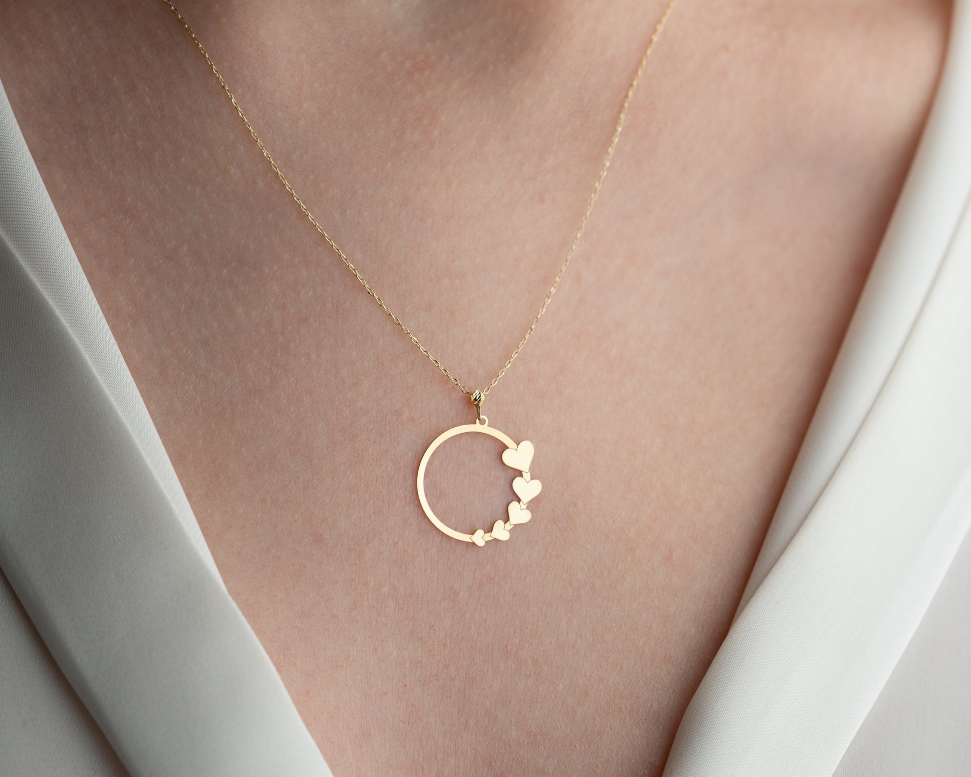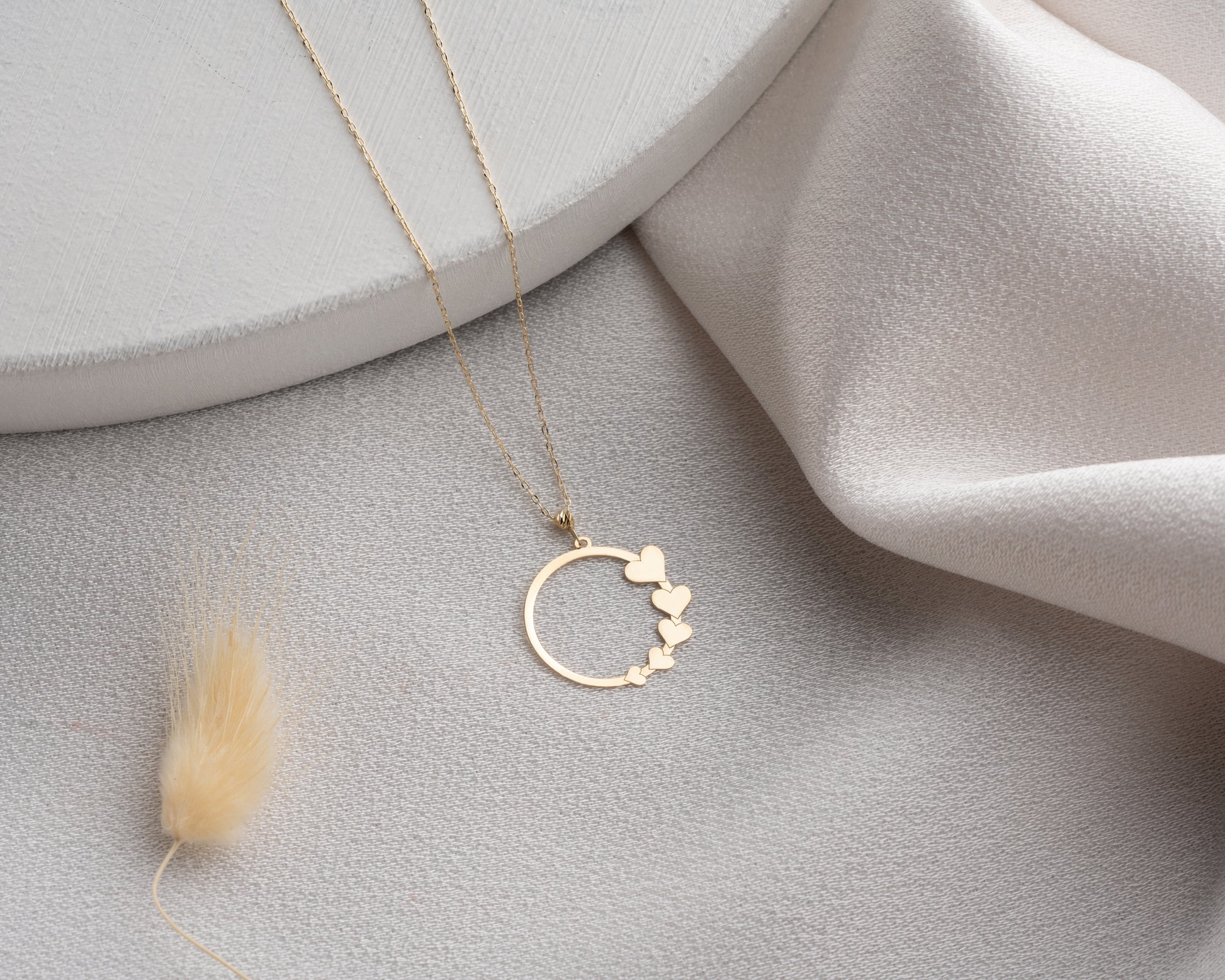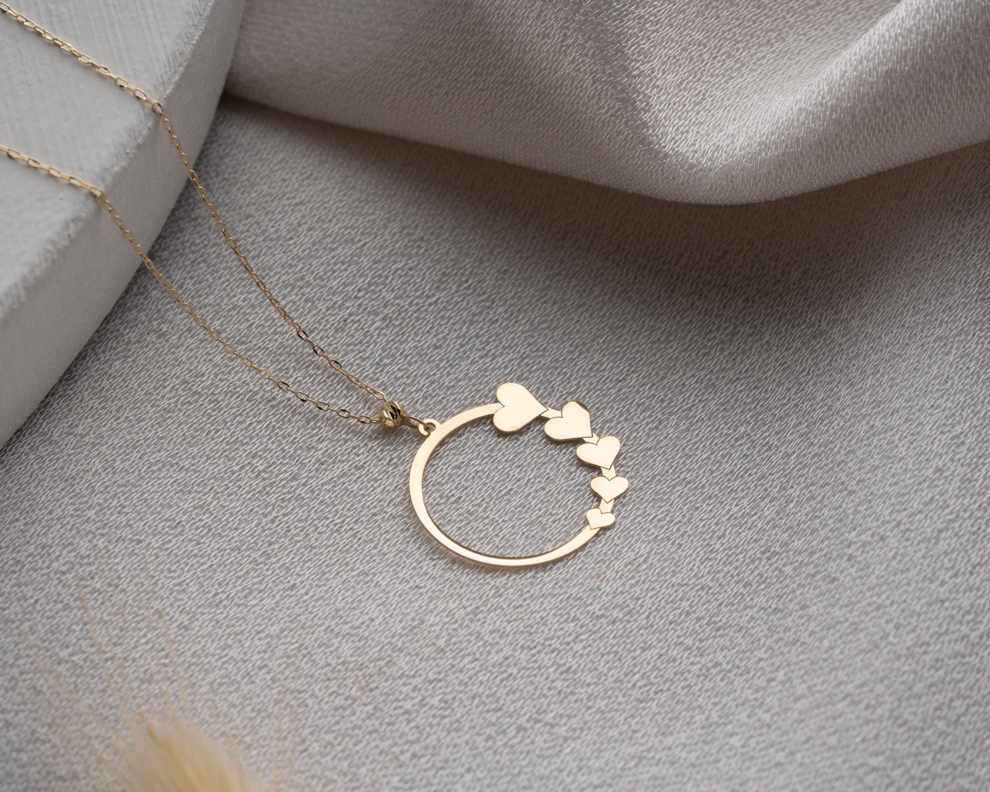 Tamamen 14 ayar altındanüretilmiş bu şık kolye, sevgi ve bağlılığı simgeleyen minimal kalplerle detaylandırılmıştır. Günlük kullanıma uygundur ve sevdikleriniz için anlamlı bir hediye olabilir.